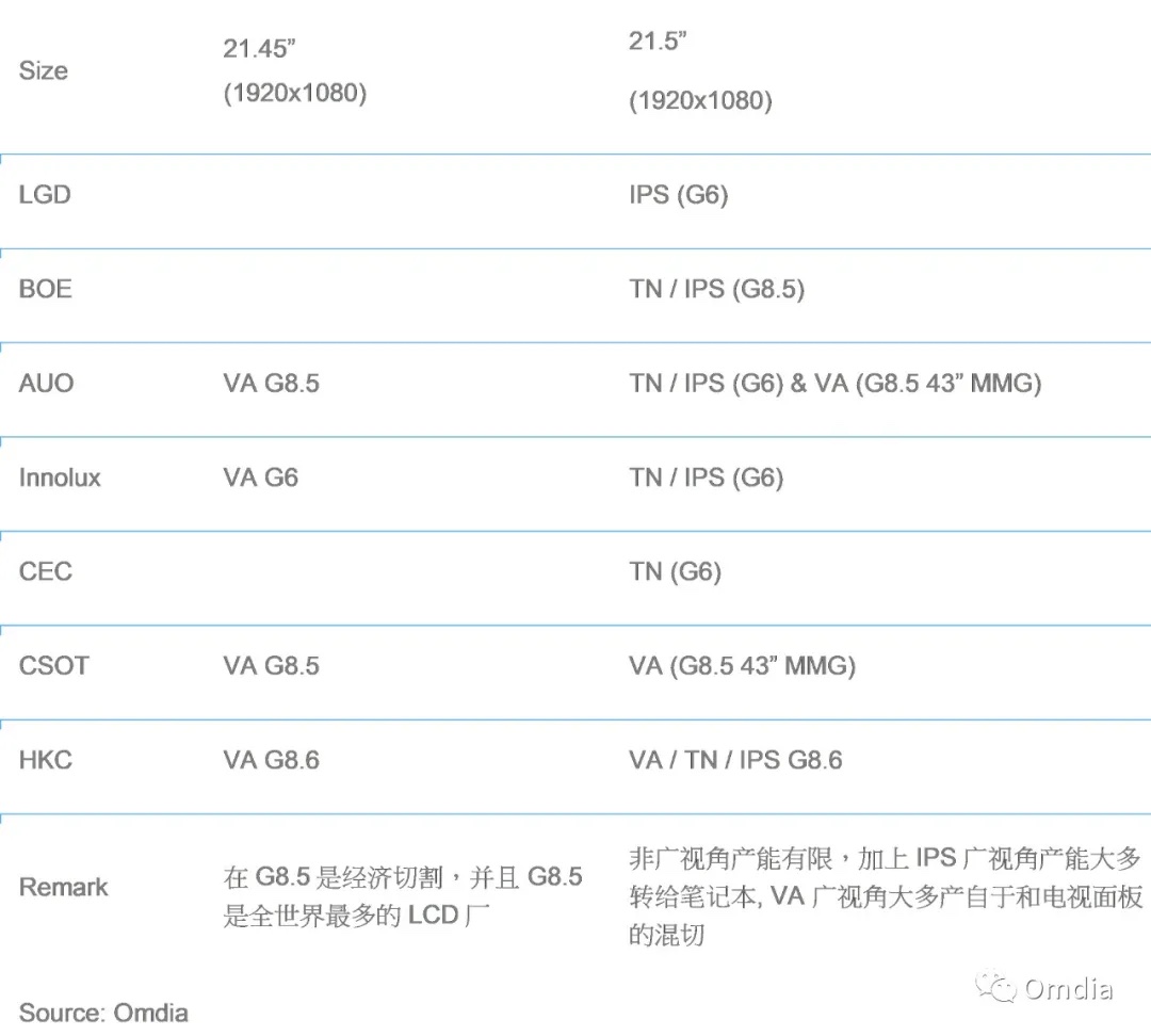 表1:21.45” vs. 21.5” 桌上型显示器面板供货商
