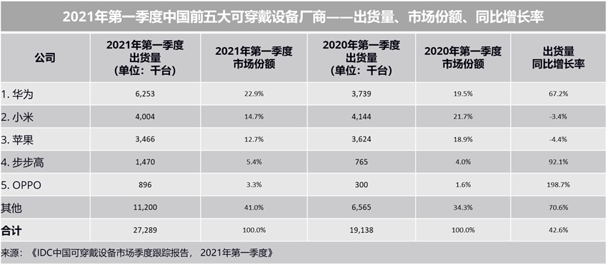 IDC:2021 Q1 中国可穿戴设备市场出货量 2729 万台,同比增长 42.6%