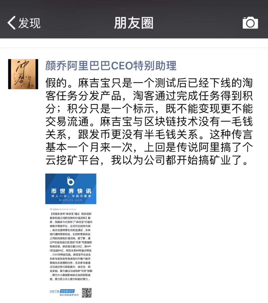 随后,阿里巴巴CEO助理乔颜在朋友圈写到,麻吉宝仅仅一个测验后现已下线的淘宝使命分发产品,淘客经过完结使命得到积分;积分仅仅一个标明,既不能变现更不能买卖流转。麻吉宝与区块链技能没有一毛钱联系,跟发币更没有半毛钱联系。